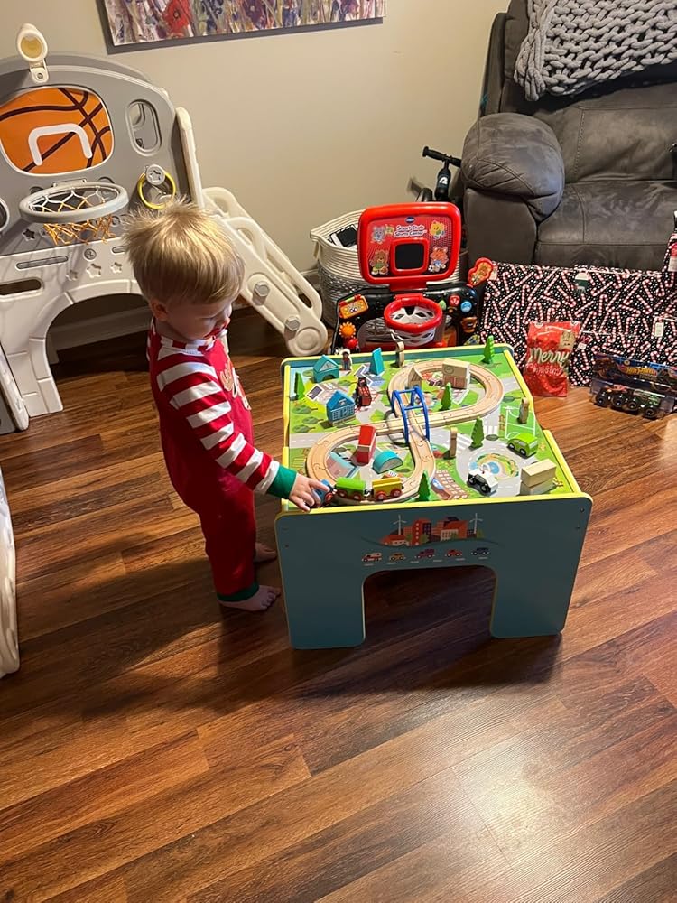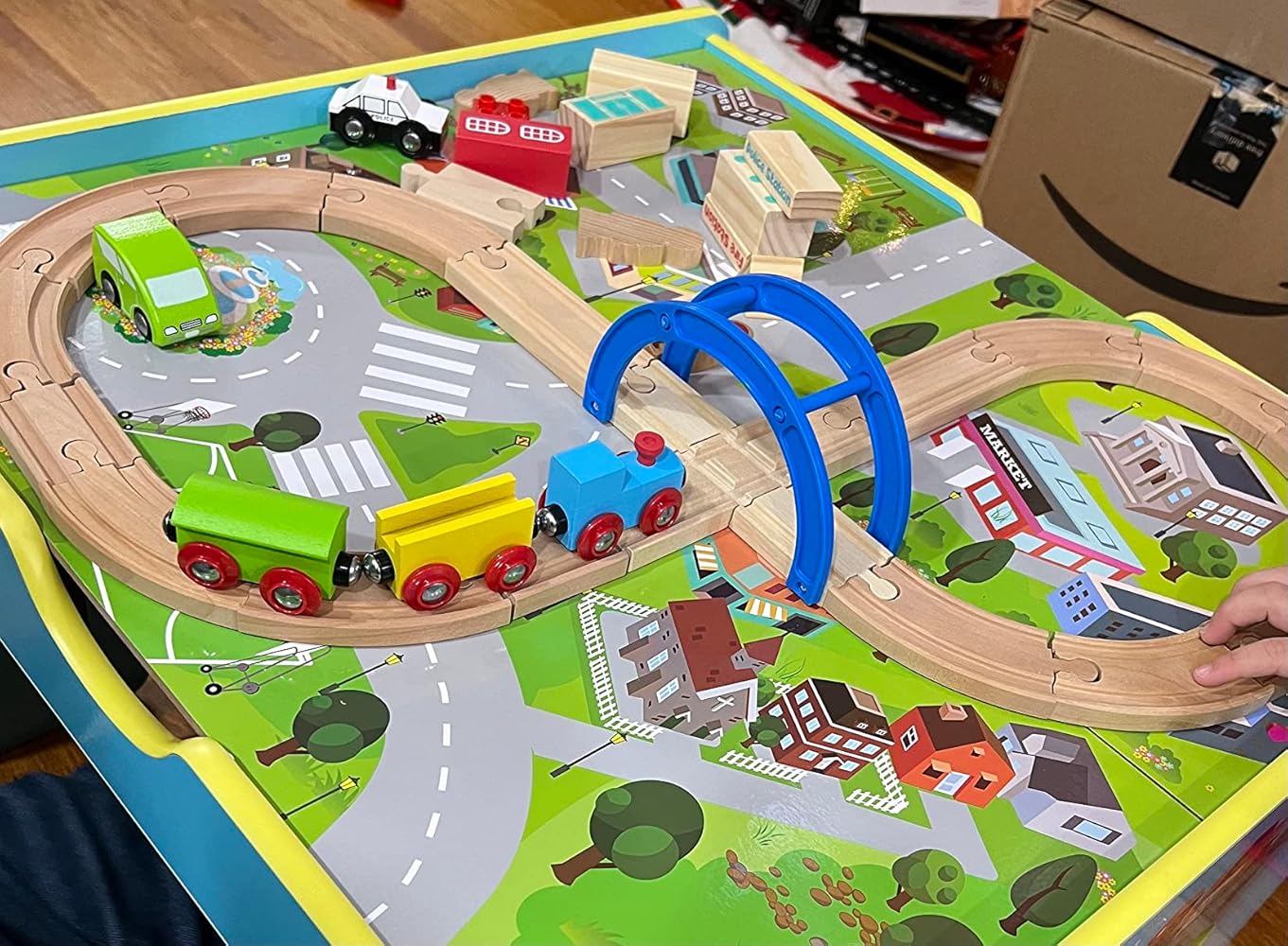 Place the train set on the removable tabletop to create an organized play zone and new ways to play.