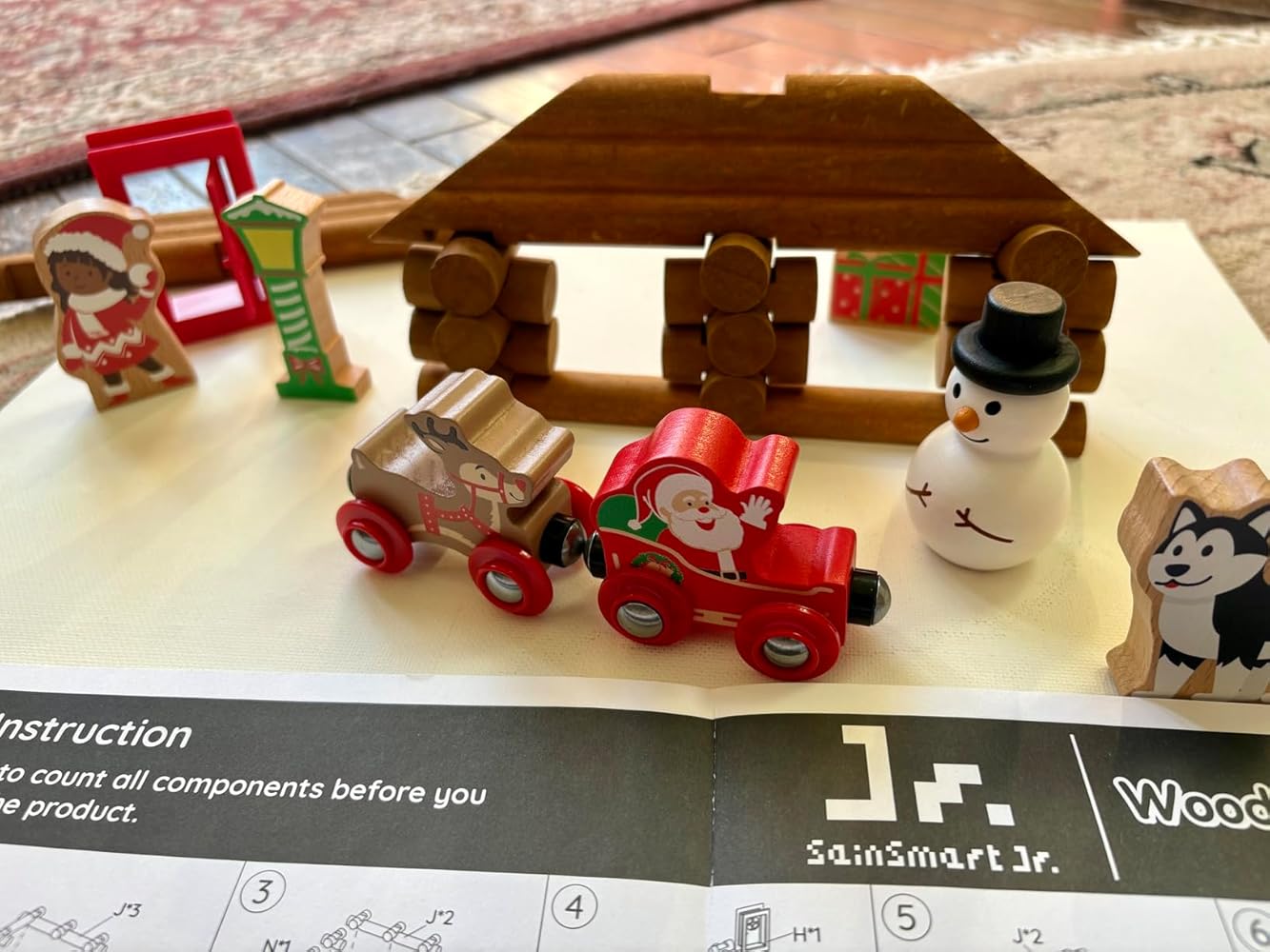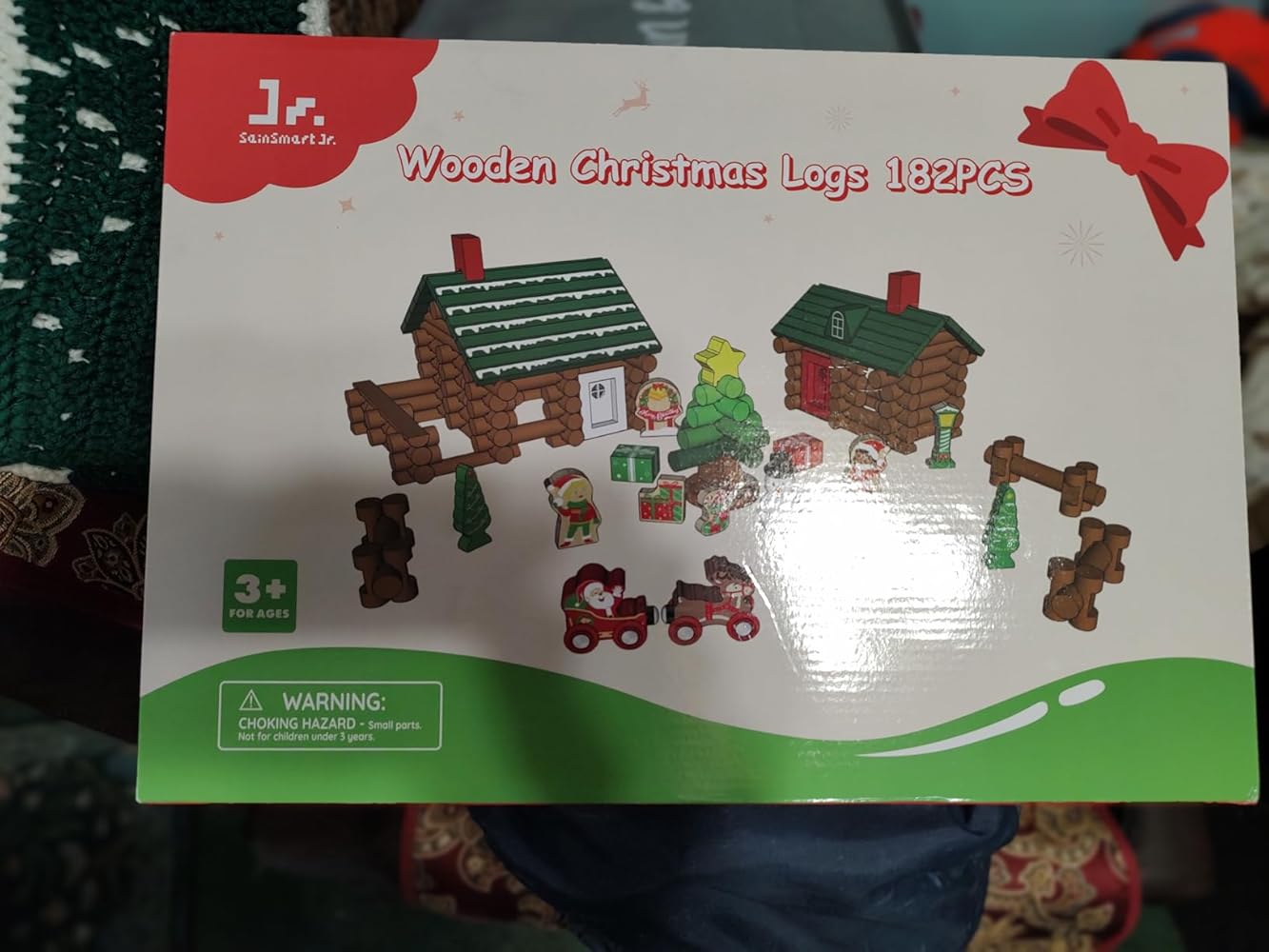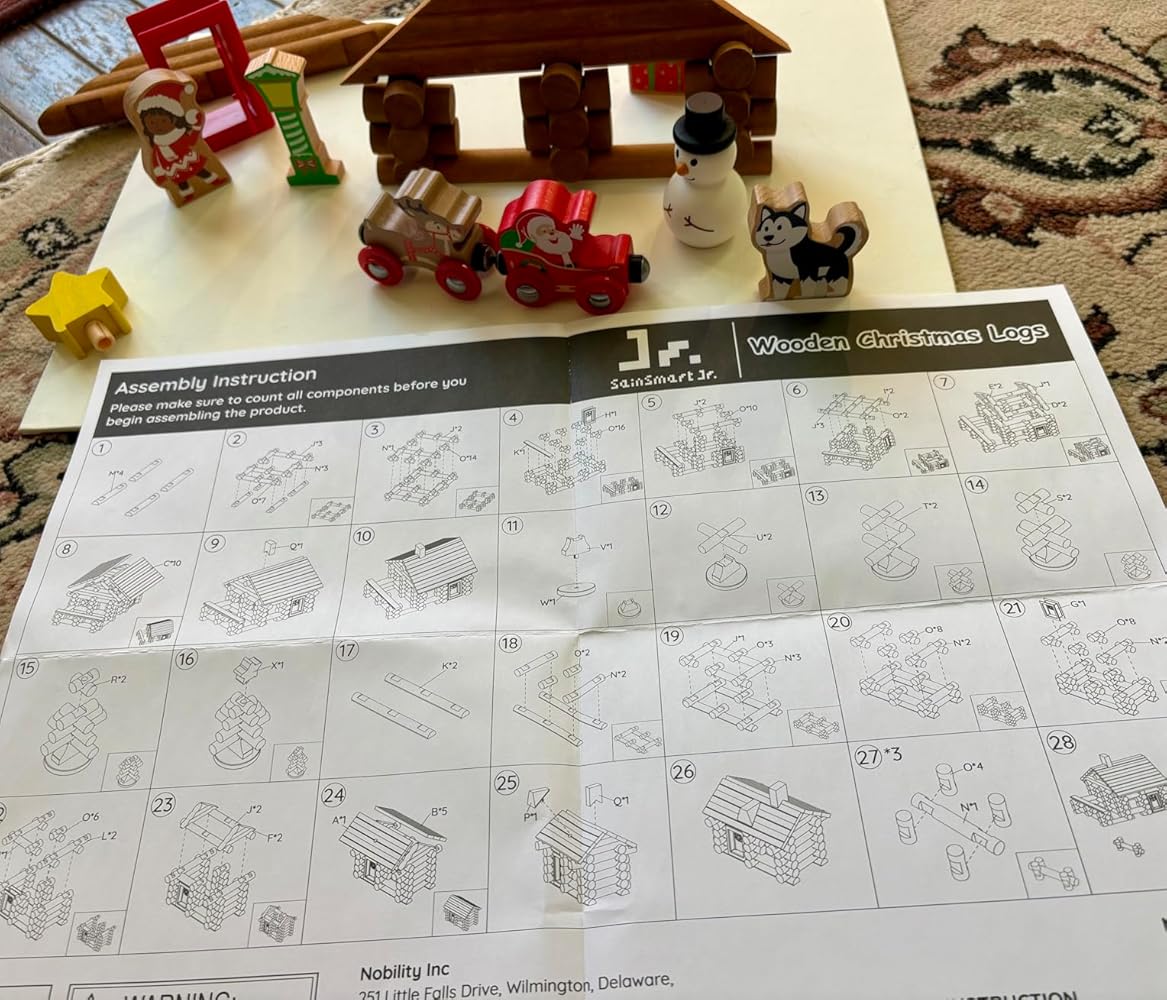 This Christmas log cabin set is designed for kids ages 3 and up. The wooden pieces are perfectly sized for little hands to build and play safely.
