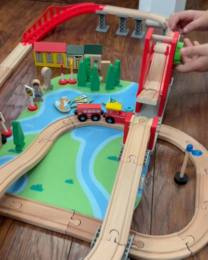 Double-Side Wood Train Track (78 PCS). With 4 trains, a lifting bridge, and puzzle & fishing. Encourages creative storytelling and hands-on play for kids
