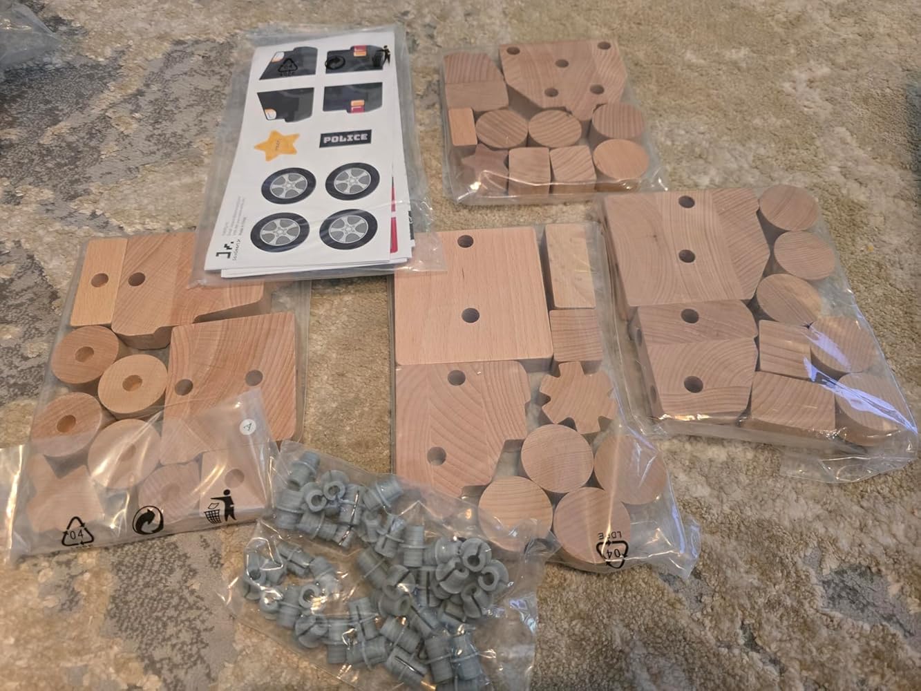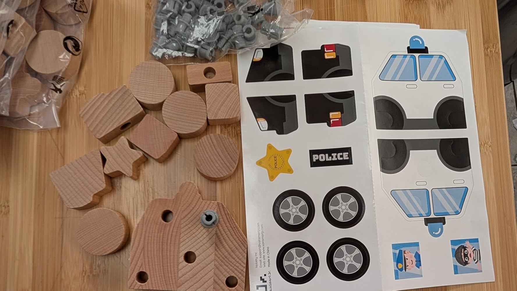 This is a nicely designed emergency vehicle assembly kit. The wooden pieces come separately packed for each of the emergency vehicles with a sticker set for each vehicle. The individual pieces fit together using plastic connectors that are durable but also allow the vehicles to be taken apart and put back together (this does mean that pieces might pop off sometimes if the vehicles are played with). These vehicles are a bit like a cross between a toy car and a wooden puzzle.This set would be great to have on hand for a rainy day or a visit to Grandma/Grandpa's house. They could be done all at once or individually. Younger children may need some help getting the stickers on straight if that is a priority for you.