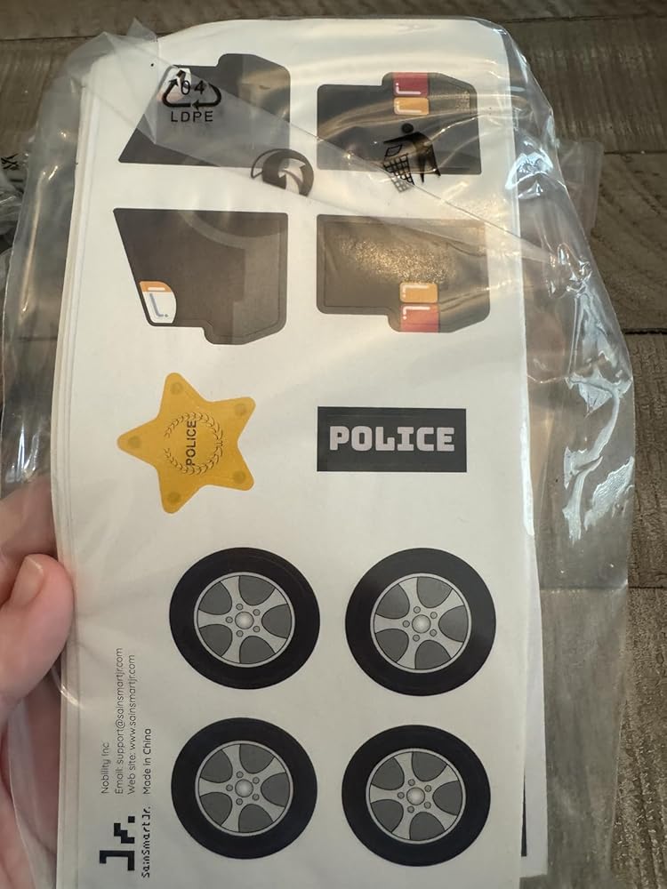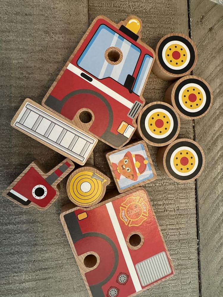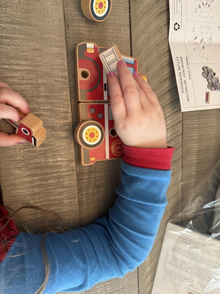 These wooden emergency vehicles are so cute and so fun for toddlers! I could hardly get them out of the box before my four year old was asking to play with them. The wood is smooth and high quality. The stickers peeled easily and fit correctly on all of the pieces. There are detailed instructions included to show which sticker pack goes with which vehicle, and they are packaged separately for convenience. I also like how many accessories were included with each vehicle to add more variety and interest (ladder, recycle bin, hose, etc).I think this is such a high quality toy, but you do have to do quite a bit of the assembly with stickers and pegs before your child can play with it. If you were to give this to a child as a gift you would definitely have to open it and assemble first. I also think the toy would be perfect if the pegs were attached to the pieces. The pegs are small, pop out easily when changing the pieces, and get lost. Overall, a very engaging toy that you can feel good about your child playing with!