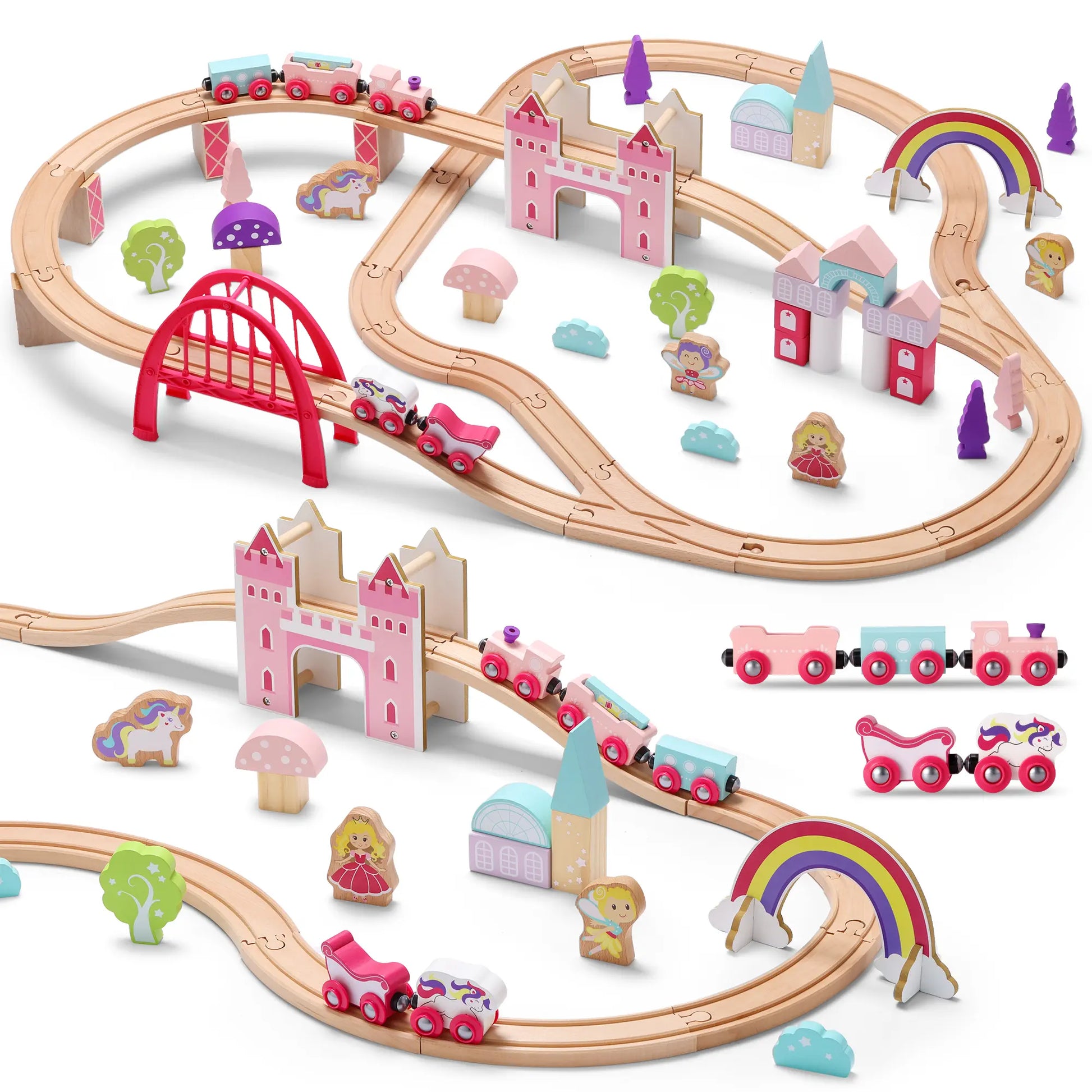 With smooth edge and non-toxic water-based paint, all wood of the kids train track set is made of 100% natural birch & beech wood from Australia.