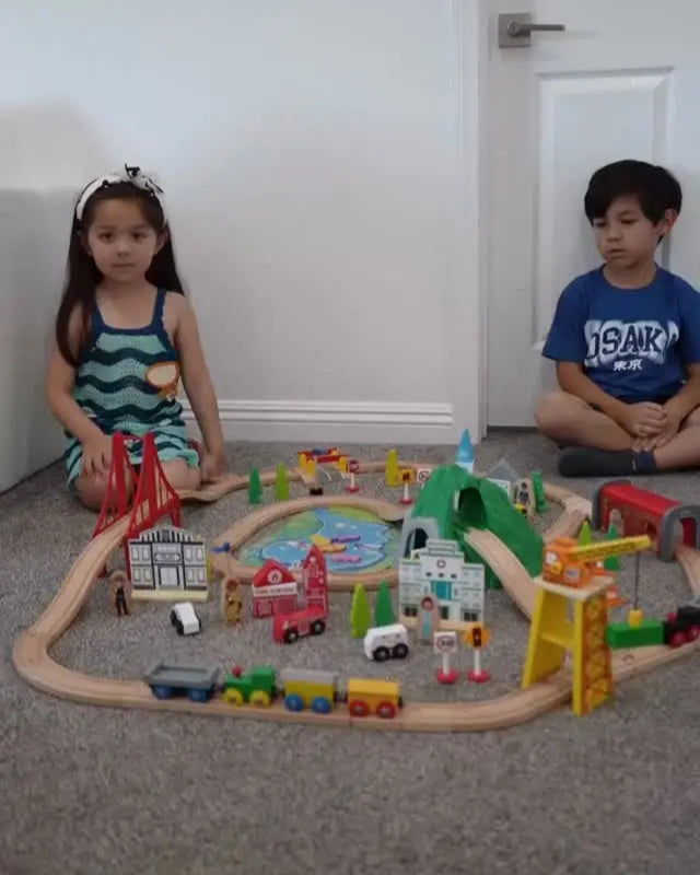 What skills can children develop by playing with this wooden train set?
